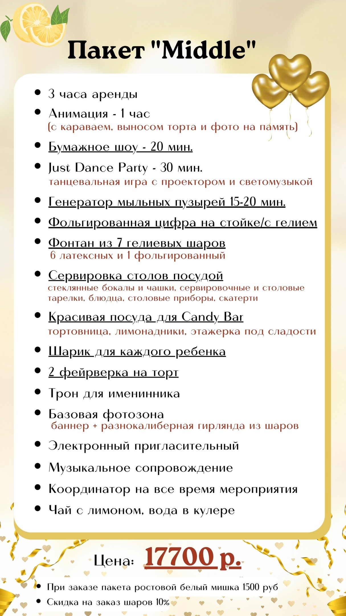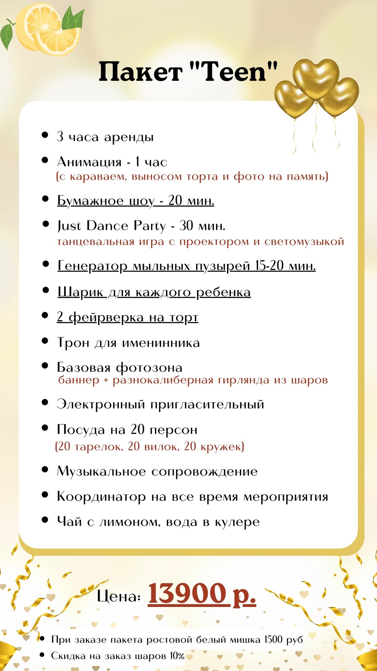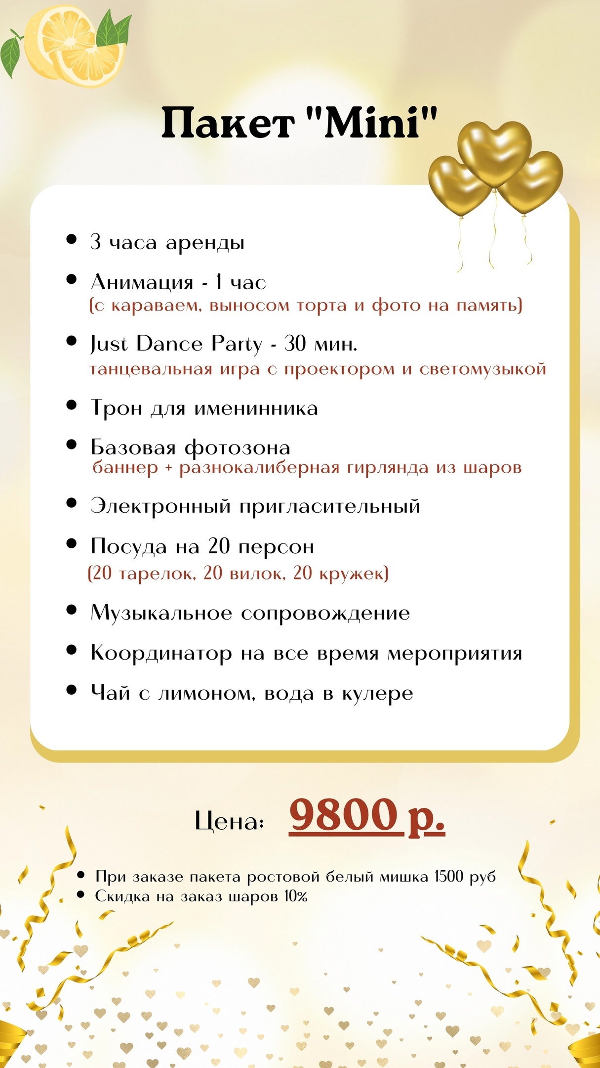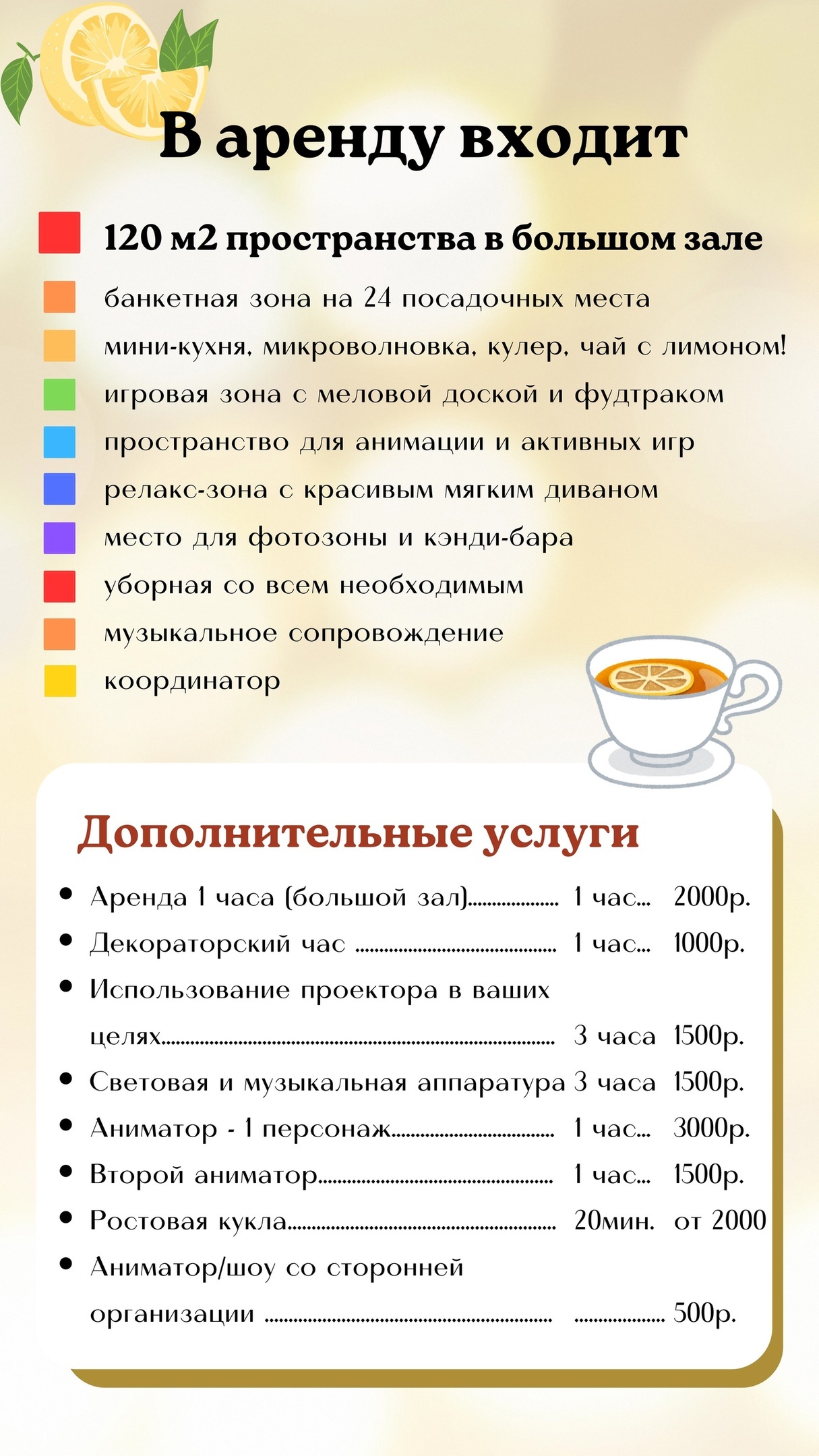 Арт-Лофт «Чай с лимоном» — это место, где каждое событие станет незабываемым. У нас вы можете организовать детский праздник, фотосессию или встречу с близкими. Просторный и светлый лофт подарит ощущение уюта и комфорта. Здесь всё создано для того, чтобы вы могли насладиться красотой и теплом в кругу самых близких людей.