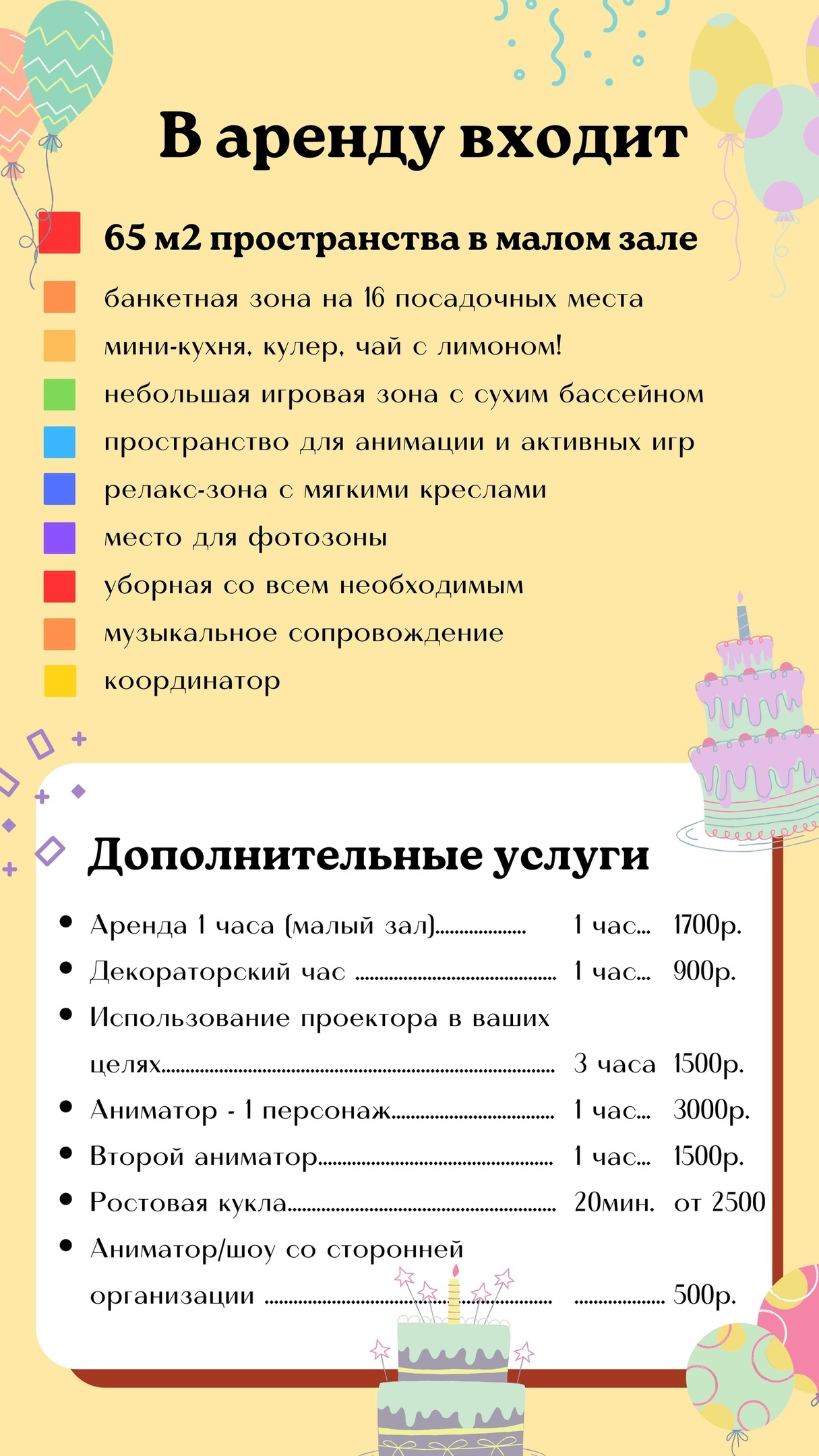 В нашем арт-лофт два зала - большой и малый. Каждый из них построен таким образом, чтобы можно было заменить "домашнюю" атмосферу. Светлые, теплые и уютные помещения, в каждом из которых есть игровая зона, большой стол со стульями для размещения гостей, уборные комнаты, зал для анимации (большой зал), фотозона.